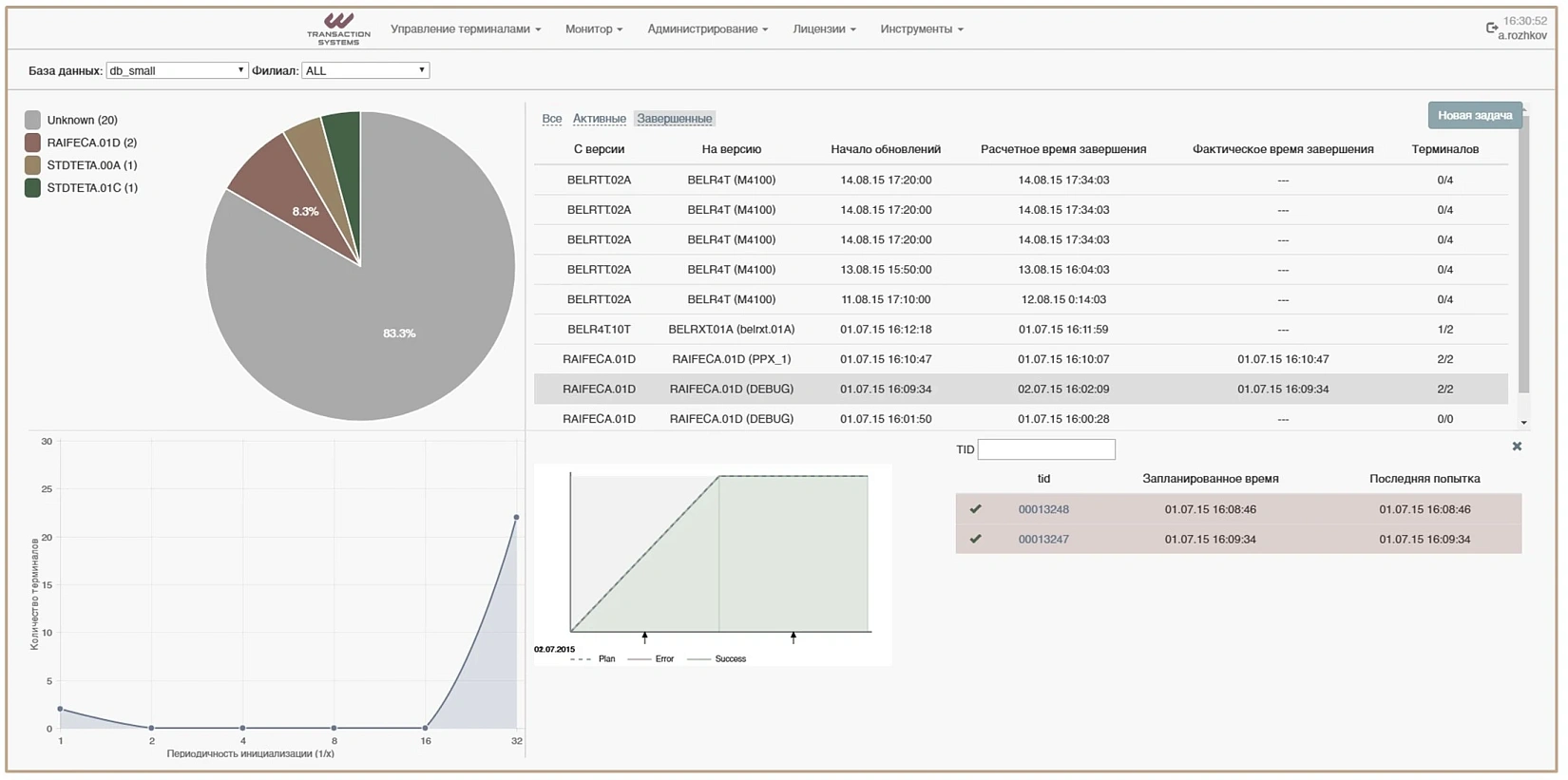 Этот модуль отслеживает работу сервера TMS, показывает распределение нагрузки, скорость соединения с сервером, что в совокупности позволяет администратору эффективно организовать процесс обновления ПО с учетом размера терминальной сети и имеющихся мощностей.