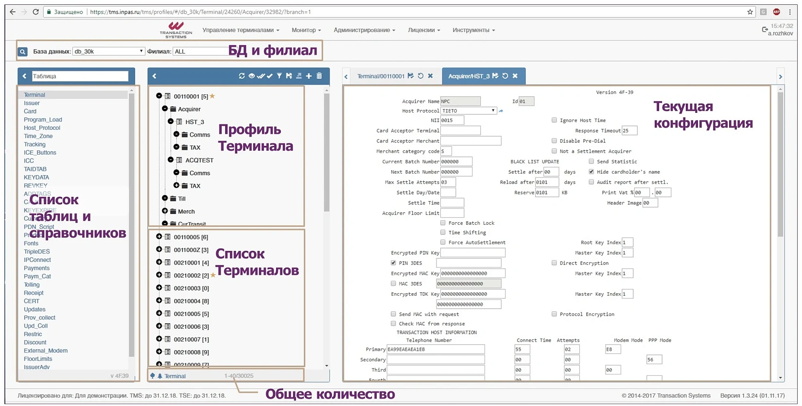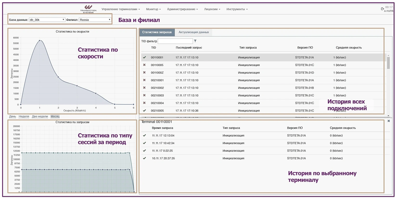 - Текущий процесс обработки запросов терминалов (количество запросов, тип, длительность)